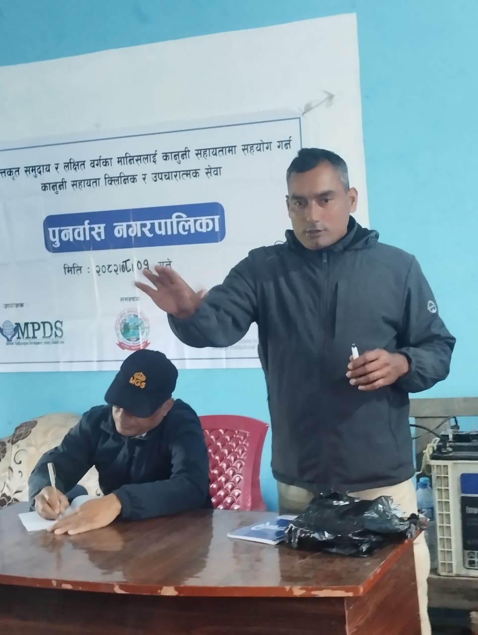 किशोर तामाङ कञ्चनपुर, ०४ मसिर। कञ्चनपुरको दक्षिणी भेग स्थित पुनर्वास नगरपालिकामा लक्षित समुदायका व्यक्तिको समस्या समाधान गर्न सरोकारवालासंग कानुन, न्याय तथा संसदीय मामिला मन्त्रालयसँगको समन्वय तथा युएनडिपिको आर्थिक सहयोगमा, बहुद्देश्यीय विकास समाज डडेल्धुराले पुनर्वास नगरपालिकामा कार्यान्वयन गर्दै आएको संस्थागत सुधार मार्फत न्यायमा पहुँच अभिवृद्धि परियोजना अन्तर्गत पुनर्वास नगरपालिका न्यायिक समिति संगको सहकार्यमा सञ्चालन हुदै आएको नगरपालिका स्तरीय ईग्जिट पोलिसी संवाद कार्यक्रम सम्पन्न भएको छ।