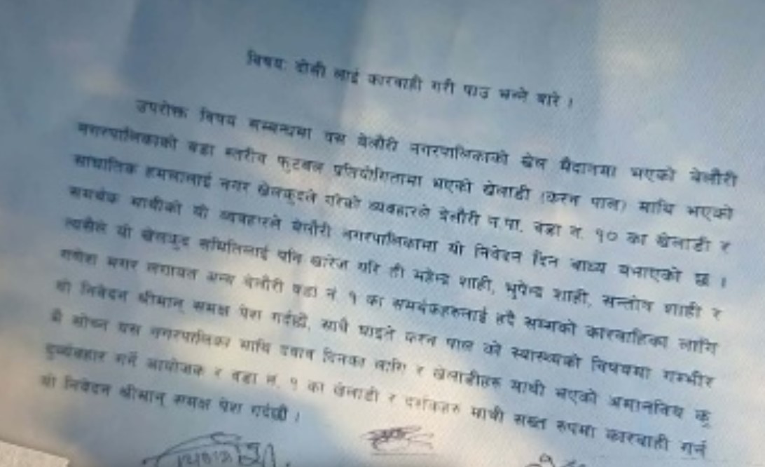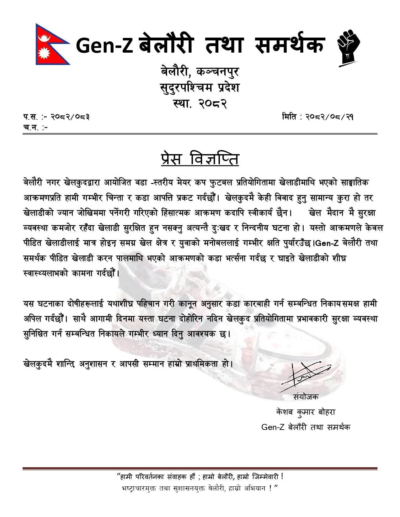 बेलौरी, कञ्चनपुर। कञ्चनपुरको बेलौरीमा जारी मेयर कप फुटबल प्रतियोगिताका क्रममा राष्ट्रिय स्तरका खेलाडी करन पालमाथि भएको साङ्घातिक आक्रमणको घटनाले उग्र रूप लिएपछि आयोजक बेलौरी नगर खेलकुद समितिले घटनाको दुई दिनपछि आफ्नो औपचारिक धारणा सार्वजनिक गरेको छ। प्रतियोगिताको व्यवस्थापन र सुरक्षा कमजोरीलाई लिएर चौतर्फी आलोचना भइरहेका बेला आयोजक समितिले आइतबार पत्रकार सम्मेलन गर्दै आफूहरू घटनाप्रति स्तब्ध भएको र दोषीलाई कुनै पनि हालतमा कारबाही हुनुपर्ने स्पष्ट पारेको छ। समितिका पदाधिकारीहरूले घटनालाई ‘नघट्नुपर्ने अप्रिय र आकस्मिक घटना’ को संज्ञा दिँदै आफूहरू पनि पीडित पक्षसँगै न्यायको पक्षमा उभिएको बताएका छन्।
