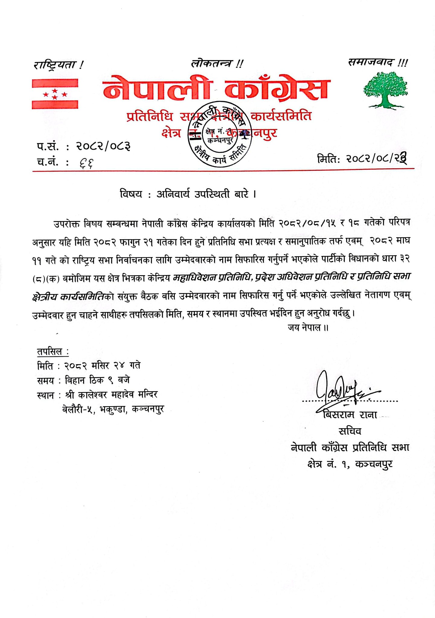 बेलौरी नगरपालिका ५, भकुन्डास्थित श्री कालेश्वर महादेव मन्दिरको प्राङ्गणमा बिहान ठिक ९ बजे बस्ने उक्त बैठकमा यस क्षेत्रभित्रका केन्द्रीय महाधिवेशन प्रतिनिधि, प्रदेश अधिवेशन प्रतिनिधि र प्रतिनिधि सभा क्षेत्रीय कार्यसमितिका पदाधिकारीहरूको अनिवार्य उपस्थितिका लागि निर्देशन दिइएको छ।