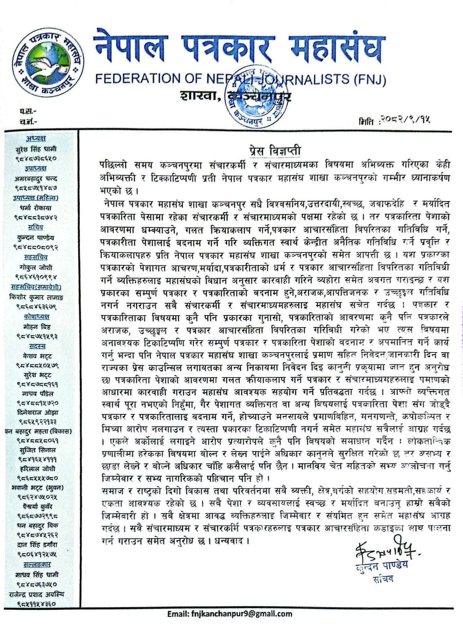 कञ्चनपुर ।नेपाल पत्रकार महासंघ शाखा कञ्चनपुरले पछिल्लो समय जिल्लामा सञ्चारकर्मी र सञ्चारमाध्यमका विषयमा भइरहेका अमर्यादित टीकाटिप्पणीप्रति गम्भीर ध्यानाकर्षण भएको जनाएको छ । महासंघले मंगलबार एक विज्ञप्ति जारी गर्दै लोकतान्त्रिक व्यवस्थामा आलोचना र खबरदारीको अधिकार सबैलाई भए पनि पत्रकारको चरित्र हत्या गर्ने र असभ्य गालीगलौज गर्ने छुट कसैलाई नभएको स्पष्ट पारेको हो ।