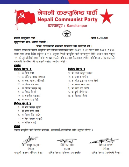 नेपाली कम्युनिष्ट पार्टी कञ्चनपुरद्वारा प्रतिनिधिसभा उम्मेदवार सिफारिस, वीना मगरदेखि लालबहादुर खड्कासम्मको नाम सूचीमा