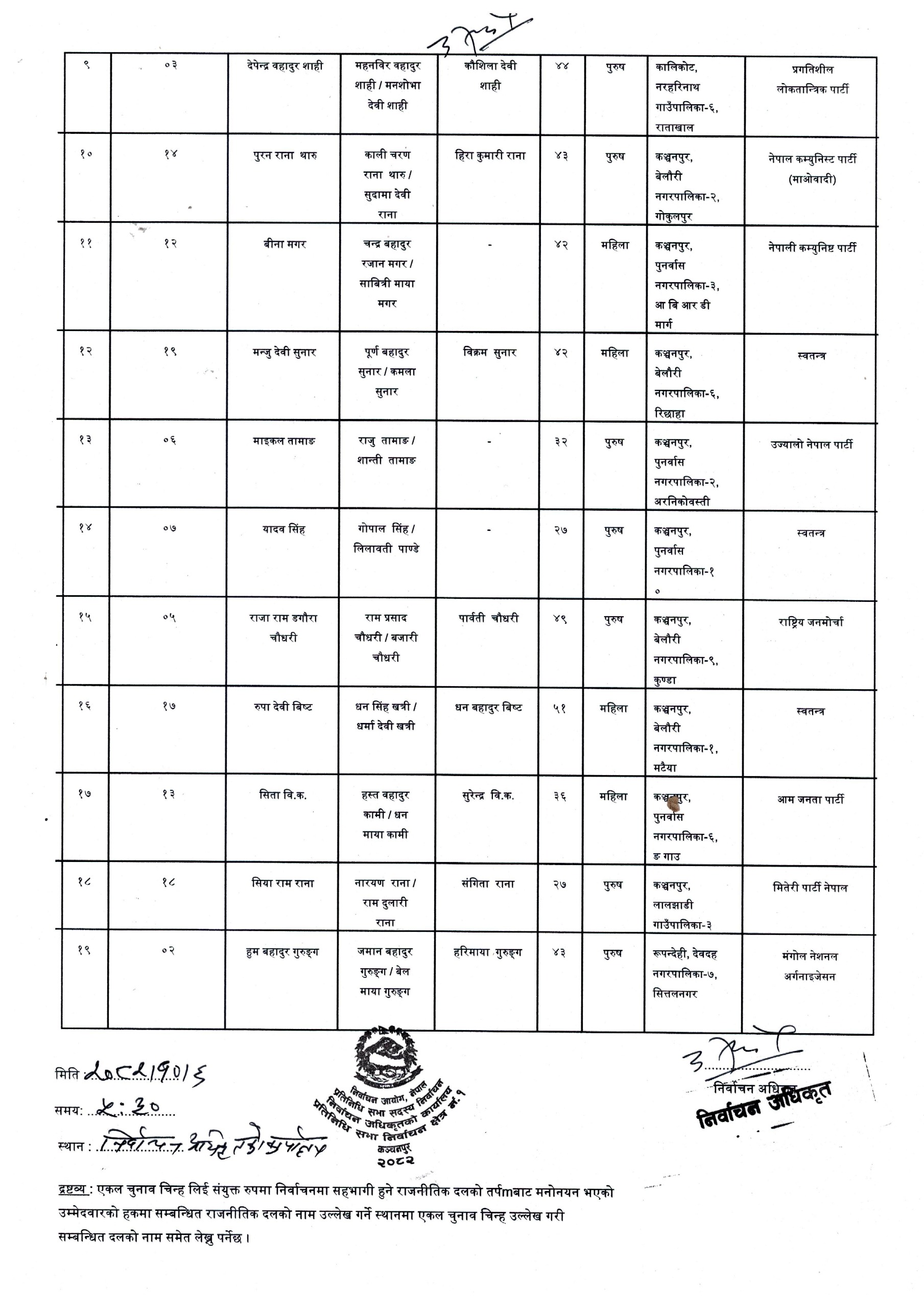 कञ्चनपुर क्षेत्र न १ निर्वाचन अधिकृतको कार्यालय अनुसार मंगलबार उत्साहजनक रूपमा सम्पन्न मनोनयन दर्ता प्रक्रियामा नेकपा (एमाले) बाट पुनर्वास नगरपालिका–३ निवासी ५२ वर्षीय निर्वतमान सांसद तारा लामा तामाङले उम्मेदवारी दर्ता गराएका छन् । तामाङको उम्मेदवारीले यस क्षेत्रमा एमालेको दाबेदारीलाई बलियो बनाएको विश्लेषण गरिएको छ । त्यस्तै, राष्ट्रिय राजनीतिमा स्थापित अनुहार एवं पूर्वमन्त्री ४२ वर्षीया वीना मगरले नेपाली कम्युनिष्ट पार्टीबाट उम्मेदवारी दिएकी छिन् । विगतका निर्वाचनमा मुख्य प्रतिस्पर्धी रहेका तामाङ र मगरको पुन: आगमनले यस क्षेत्रको चुनावी माहोल तताएको छ ।