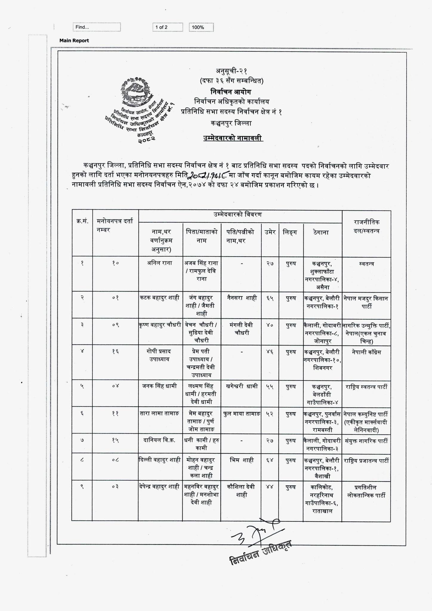 कञ्चनपुर प्रतिनिधि सभा निर्वाचन क्षेत्र नं १ मा उम्मेदवारी दर्ता गराएका सबै १९ जना उम्मेदवारहरूको मनोनयन कानून बमोजिम सदर भएको छ। निर्वाचन अधिकृतको कार्यालयले दर्ता भएका कुनै पनि मनोनयन रद्द नभएको र सबै उम्मेदवारहरू रीतपूर्वक योग्य ठहरिएको जनाएको छ।