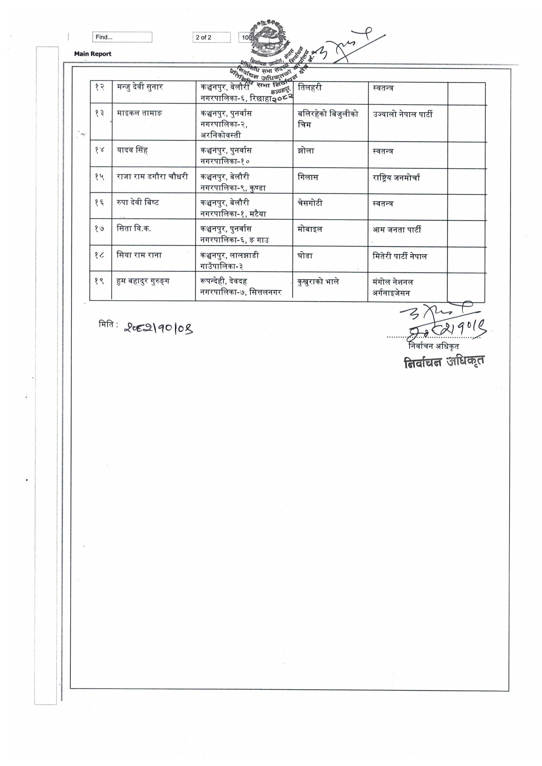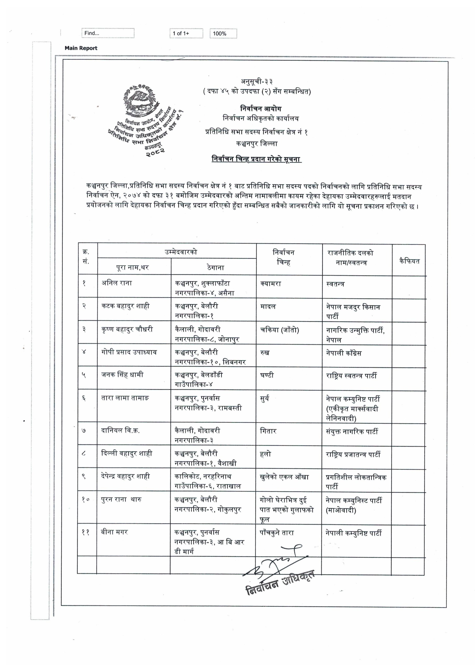 प्रतिनिधि सभा सदस्य निर्वाचनका लागि कञ्चनपुर निर्वाचन क्षेत्र नं १ मा उम्मेदवारी दिएका सबै १९ जना उम्मेदवार चुनावी प्रतिस्पर्धामा कायम रहेका छन् । निर्वाचन अधिकृतको कार्यालयले तोकिएको समयसीमाभित्र कसैले पनि उम्मेदवारी फिर्ता नलिएपछि अन्तिम नामावली प्रकाशन गर्दै आज उम्मेदवारहरूलाई निर्वाचन चिन्ह प्रदान गरेको हो ।
