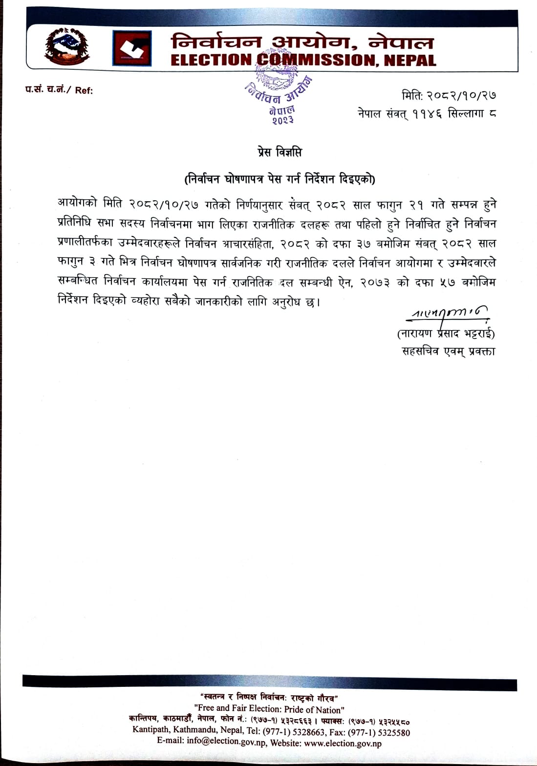 निर्वाचन आयोगले आगामी निर्वाचनका लागि सहभागी हुने राजनीतिक दलहरूलाई फागुन ३ गतेभित्र आफ्नो चुनावी घोषणापत्र सार्वजनिक गरी आयोगमा पेस गर्न निर्देशन दिएको छ। निर्वाचनलाई व्यवस्थित, मर्यादित र समयबद्ध बनाउने प्रक्रिया अन्तर्गत आयोगले यस्तो समयसीमा तोकेको हो।