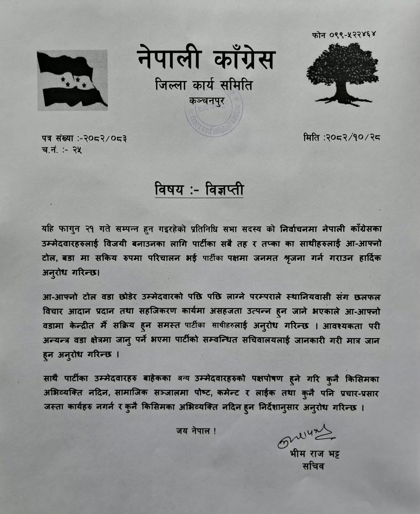 पार्टीको अनुशासन र चुनावी रणनीतिलाई प्रभावकारी बनाउने उद्देश्यले कांग्रेस कञ्चनपुरले बुधबार एक विज्ञप्ति जारी गर्दै यस्तो निर्देशन दिएको हो । जिल्ला सचिव भीम भट्टद्वारा हस्ताक्षरित उक्त विज्ञप्तिमा पार्टीका उम्मेदवार बाहेक अन्य दलका उम्मेदवारहरूको पक्षपोषण हुने गरी कुनै पनि अभिव्यक्ति नदिन सचेत गराइएको छ । विशेषगरी सामाजिक सञ्जाल फेसबुक, ट्विटर लगायतका प्लेटफर्ममा विपक्षीका पोस्टहरूमा ‘लाइक’, ‘कमेन्ट’ वा सेयर गरेर उनीहरूको प्रचारप्रसारमा सहयोग पुग्ने कार्य नगर्न कार्यकर्ताहरूलाई स्पष्ट पारिएको छ ।