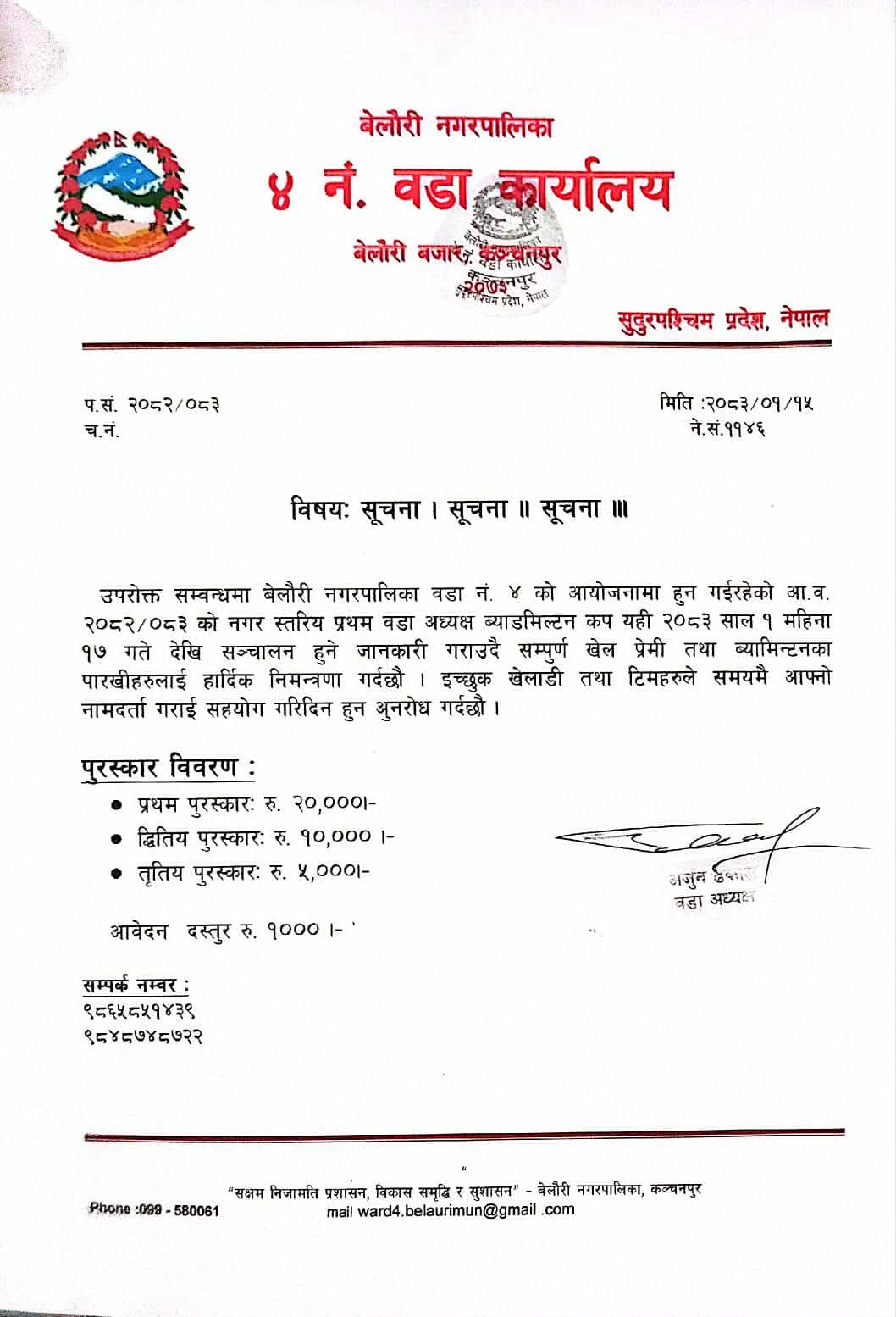 कञ्चनपुरको बेलौरी नगरपालिका वडा नम्बर ४ को आयोजनामा आगामी वैशाख १७ गतेदेखि नगर स्तरीय ‘प्रथम वडा अध्यक्ष ब्याडमिन्टन कप’ सञ्चालन हुने भएको छ। वडा कार्यालयले एक सूचना जारी गर्दै खेल प्रेमी तथा ब्याडमिन्टनका पारखीहरूलाई प्रतियोगितामा सहभागी हुन औपचारिक निमन्त्रणा गरेको छ।